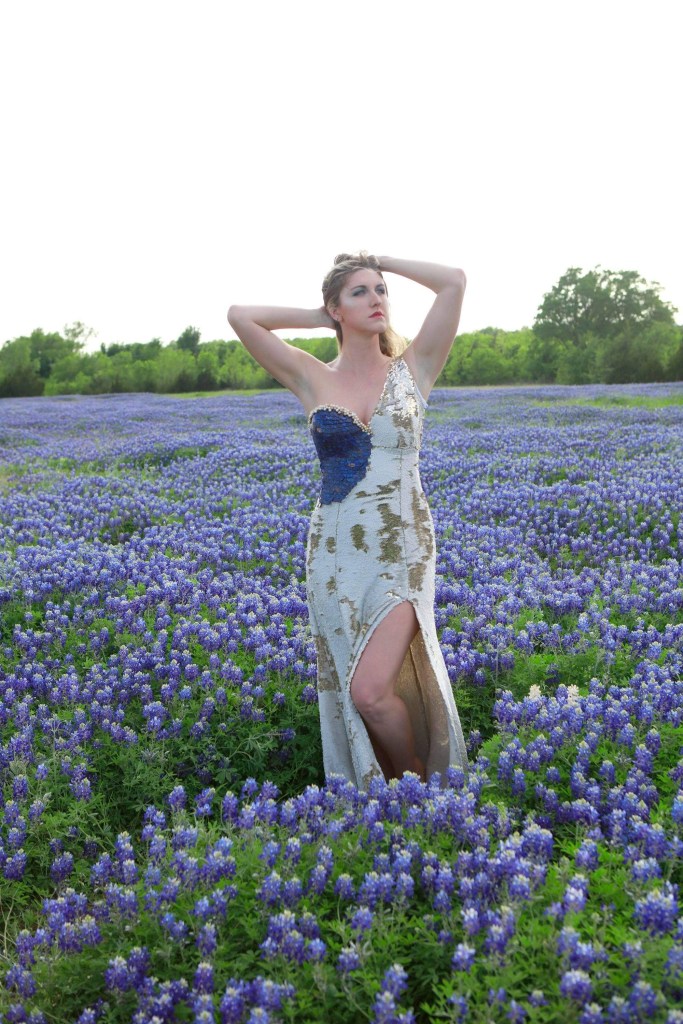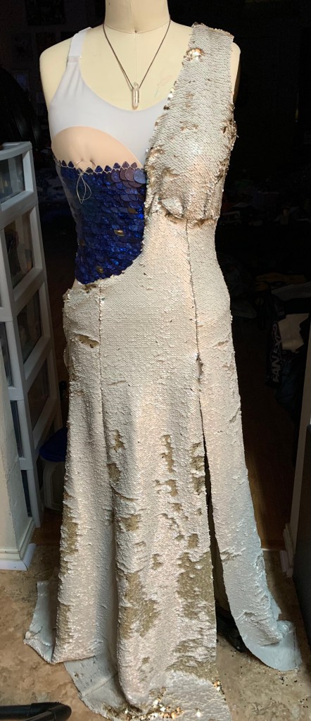 This was a simple design for a fellow Mermaid who was competing in the Miss Mermaid USA pageant. She is an advocate for recycling and cleaning up our Lakes, rivers and oceans. So along with the two-tone sequin fabric, I decided to use my guitar pick method on part of the bodice for reusing and upcycling.